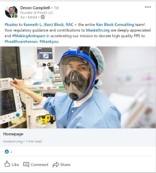 新型コロナウイルス対策に伴い、Ken Block Consulting LLC(米国本社)が支援していますMasksOn.org PPEの緊急使用許可(EUA)の取り組みが称賛を受けました。